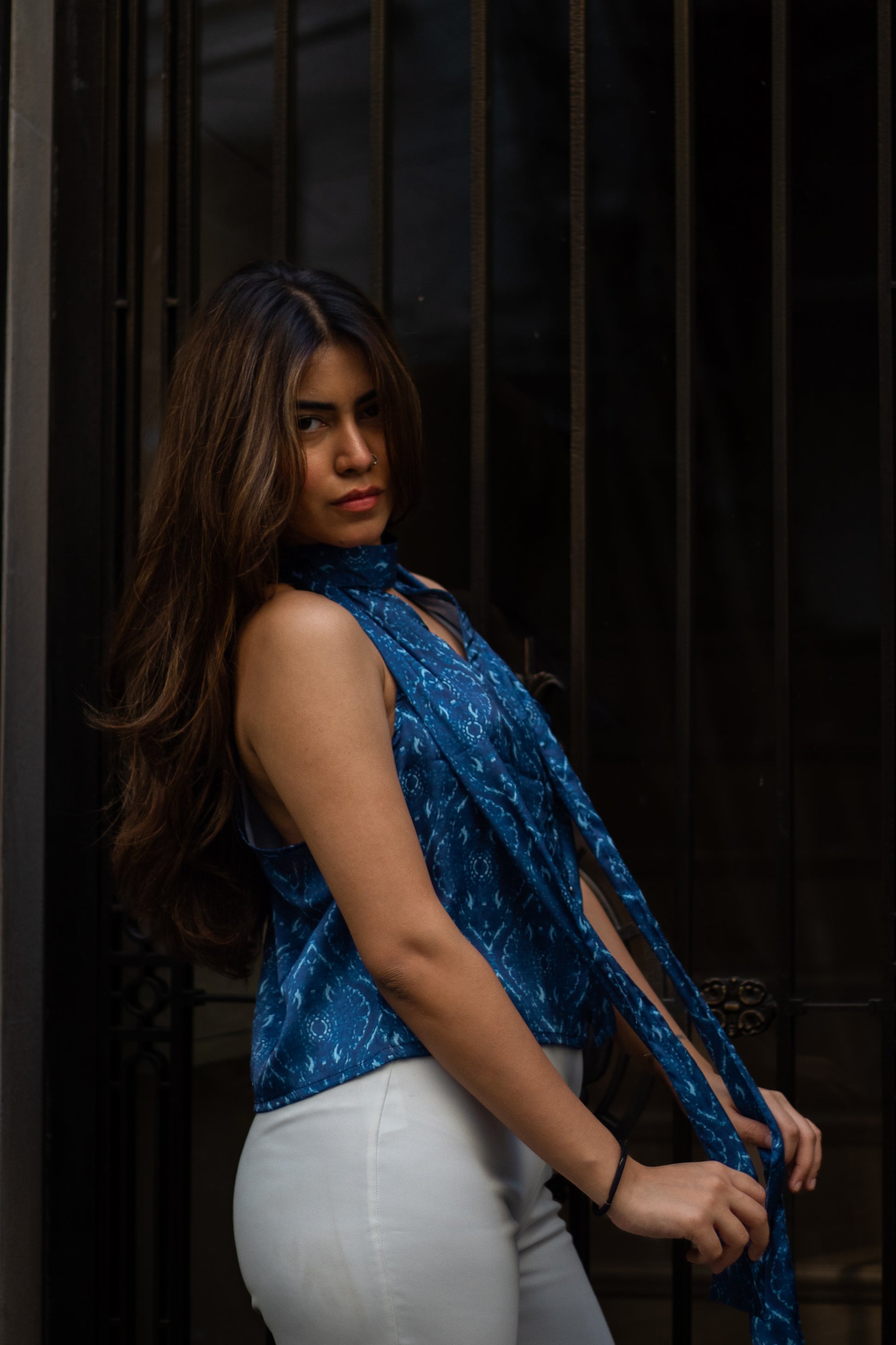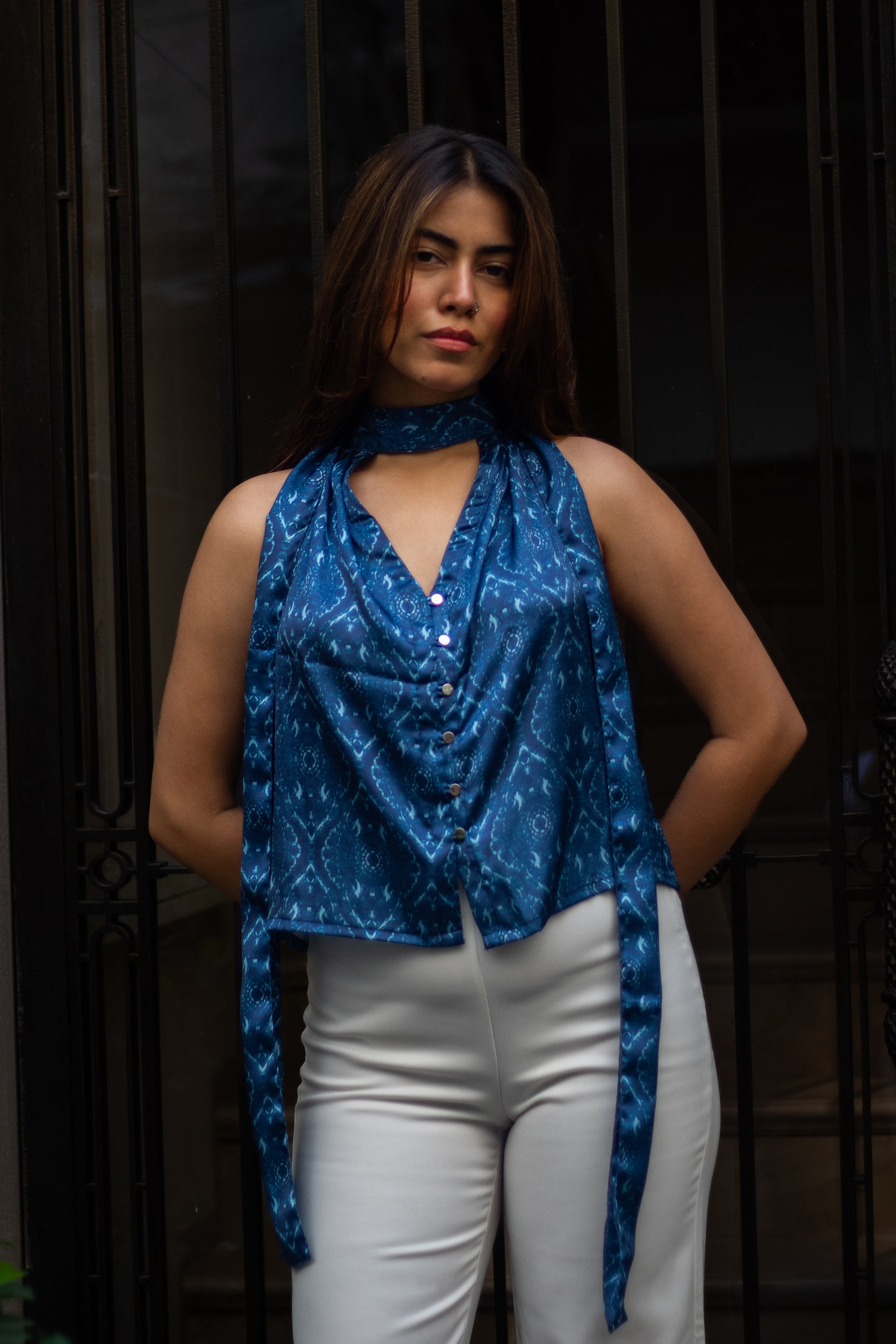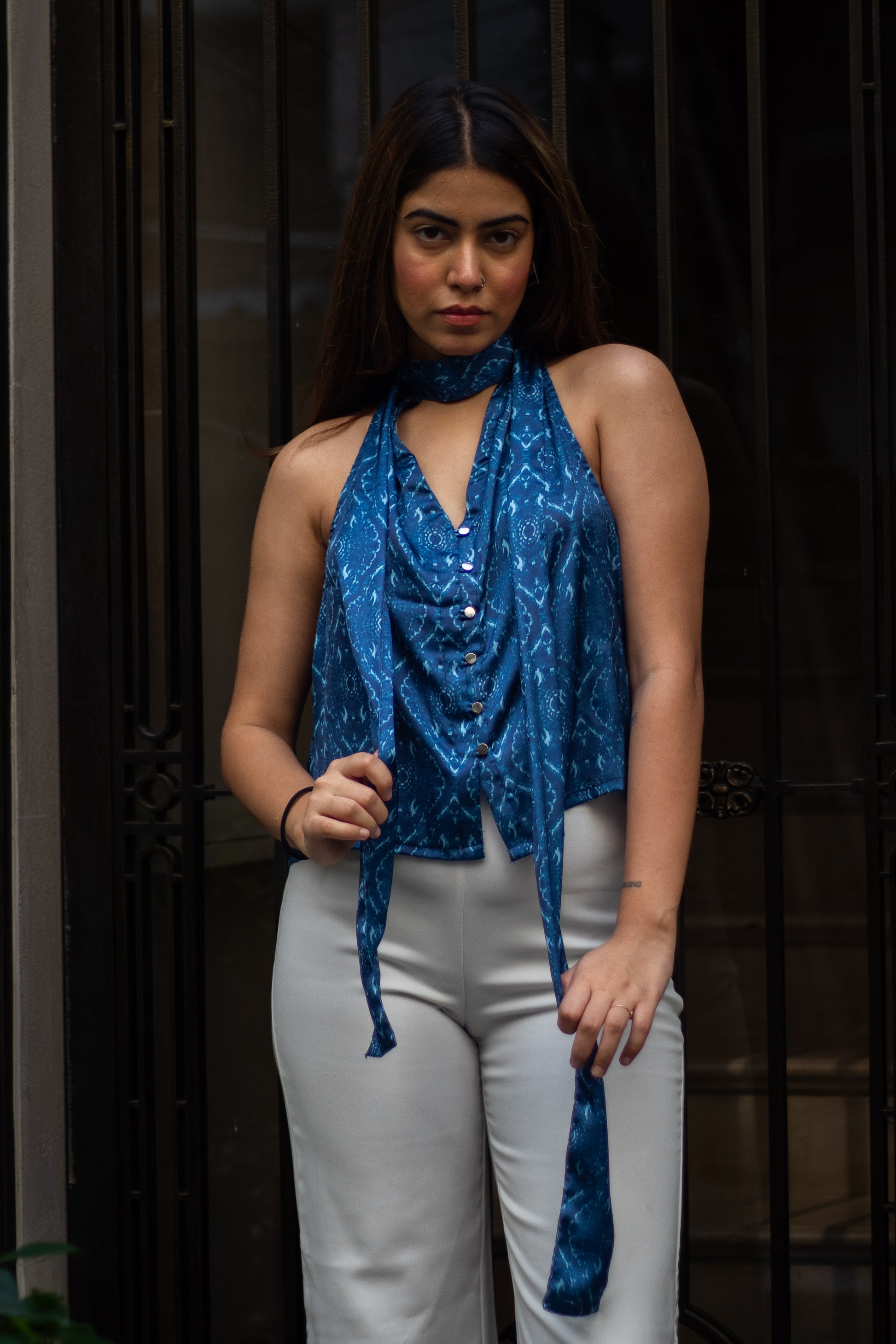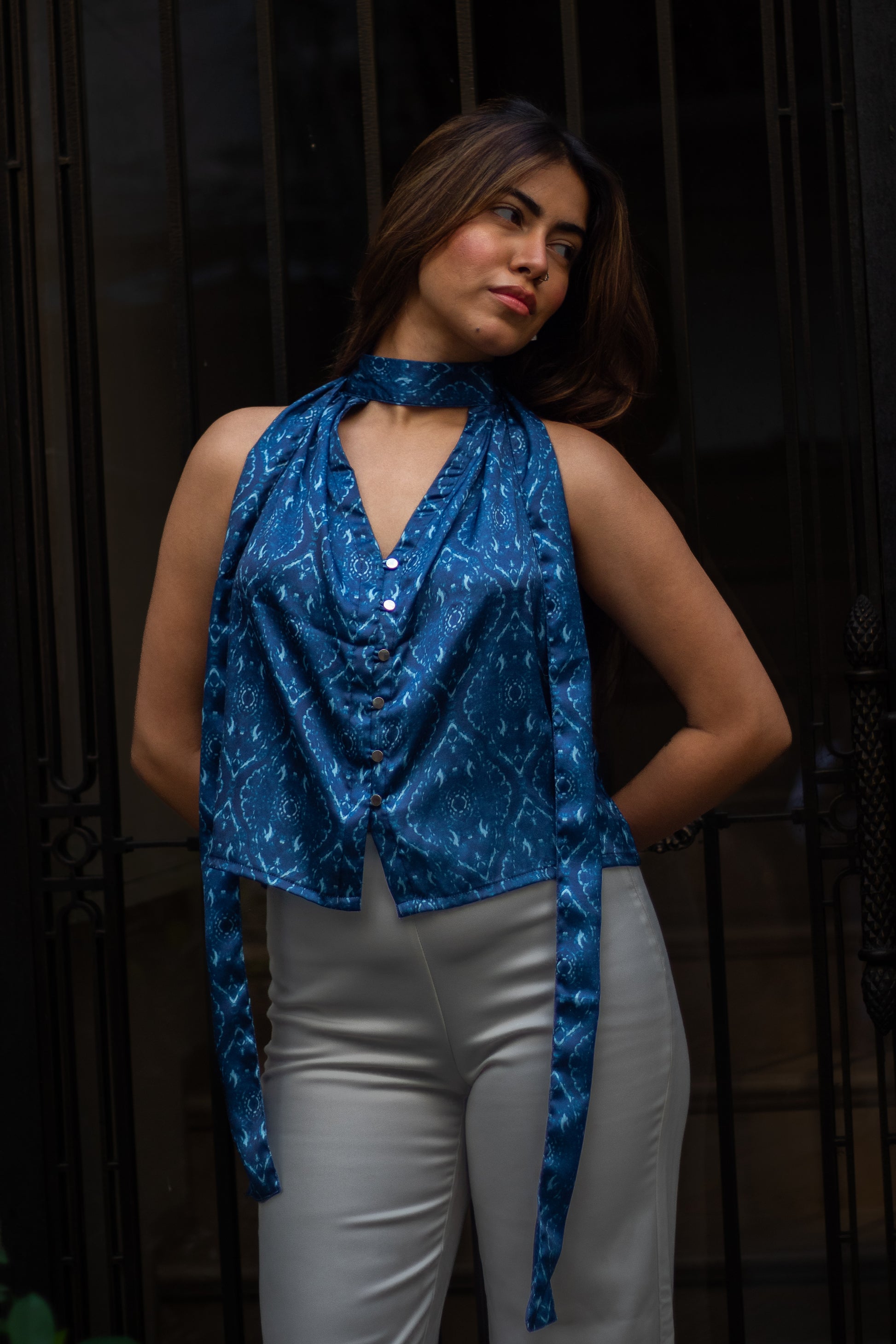 Fresh, bold, and endlessly versatile, Mimosa 2.0 is your new day-to-night essential. Cut in luxurious Armani satin with a striking blue paisley print, it’s the top that takes you from sunny brunches to dinner dates to club nights without missing a beat. The halter neckline flatters effortlessly, while the added matching scarf lets you style it your way—tie it, drape it, or wear it as an accessory for that extra flair.