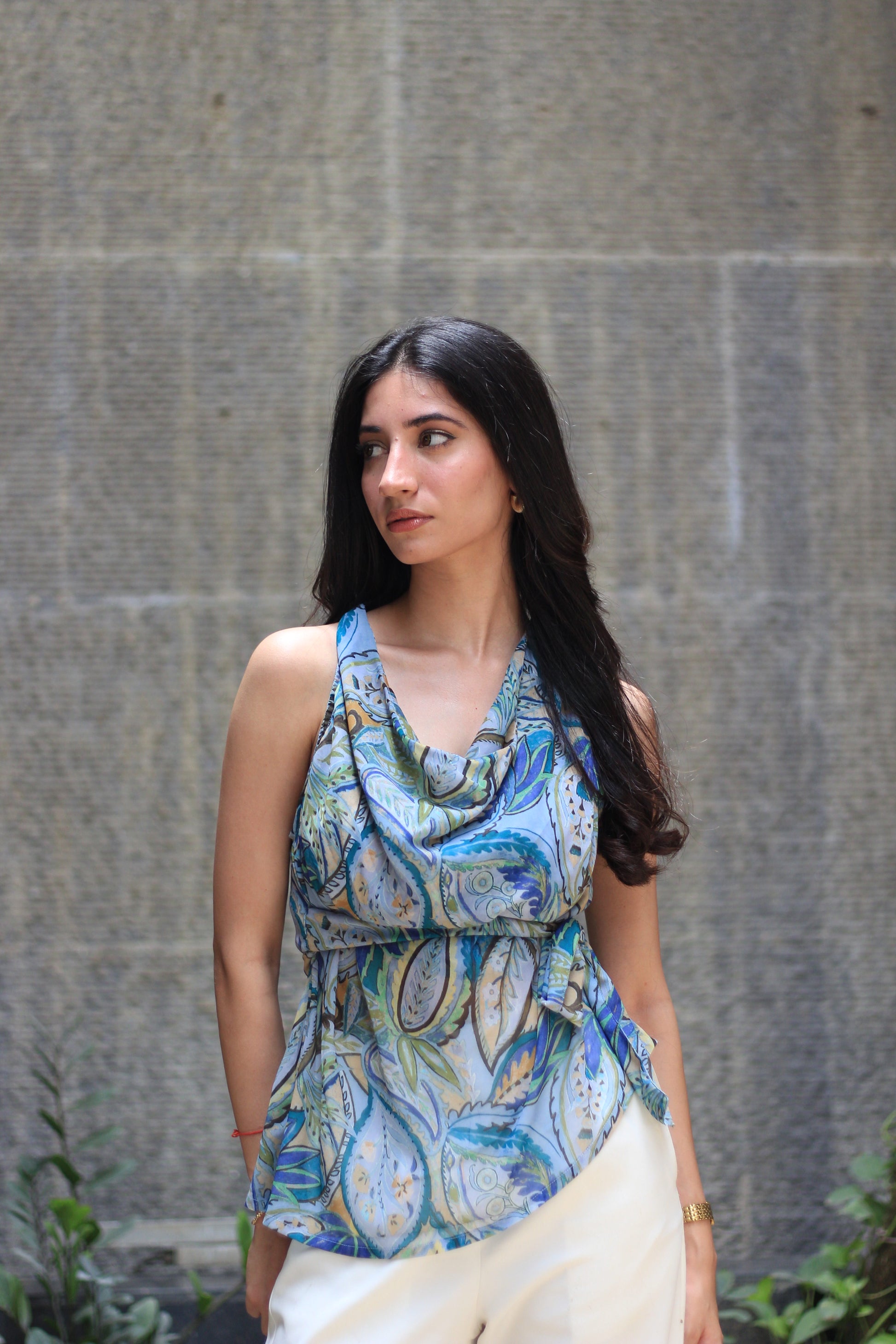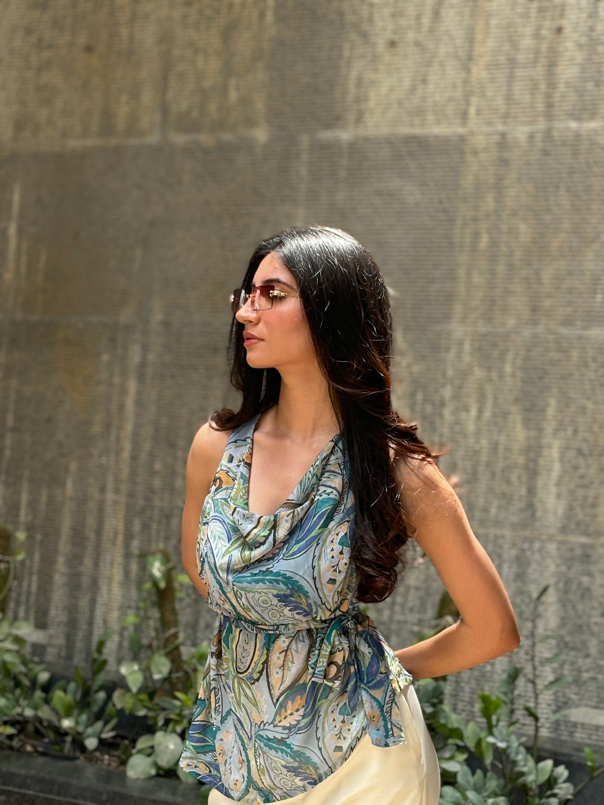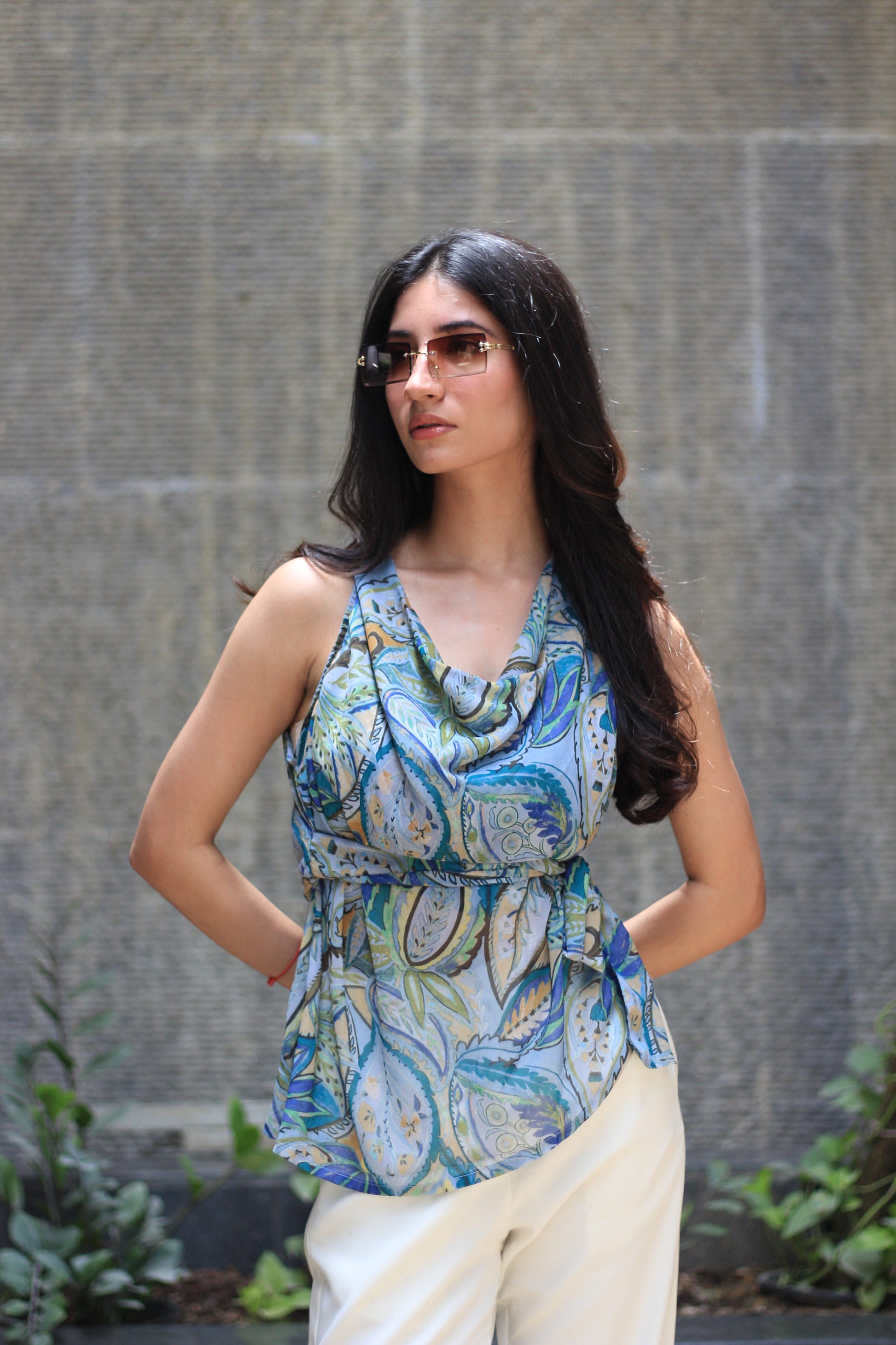 Cool, coastal, and a little bit flirty, The Ocean Martini Top is the definition of effortless glam. Crafted in a printed georgette, it features a breezy cowl neckline and an asymmetric hem that moves with you. The waist comes with a soft self-tie belt to cinch things in just the right way, giving you shape without sacrificing ease.