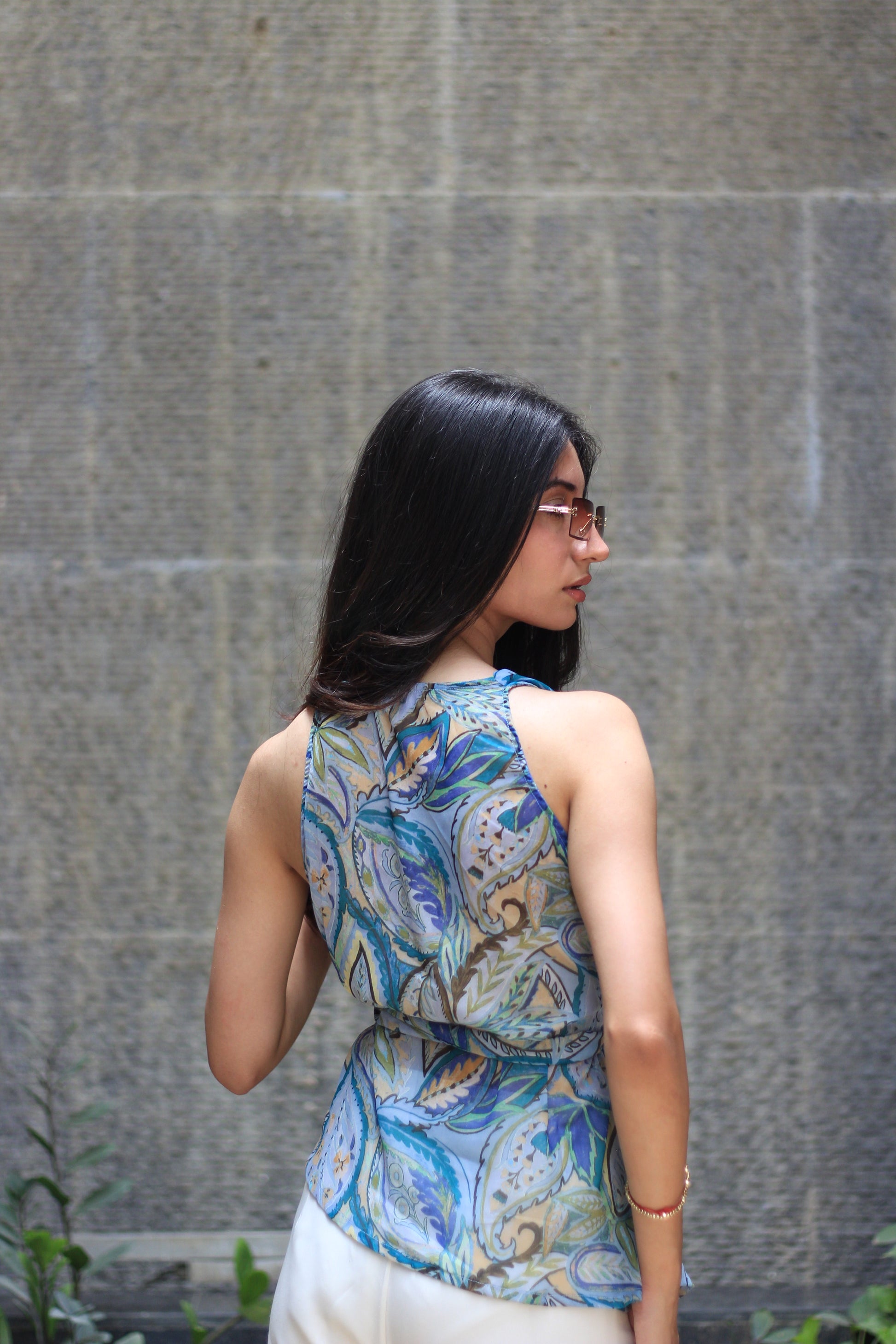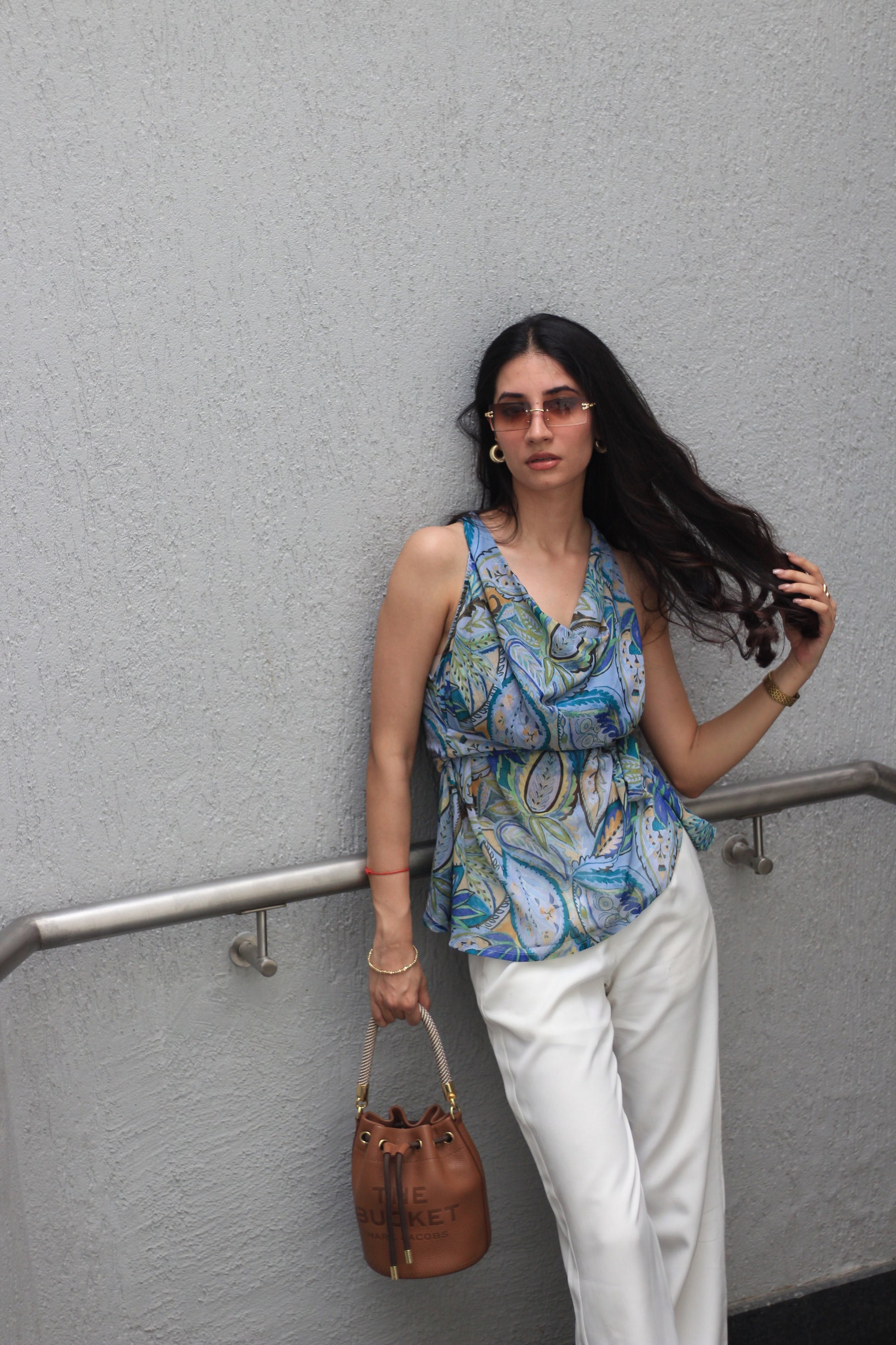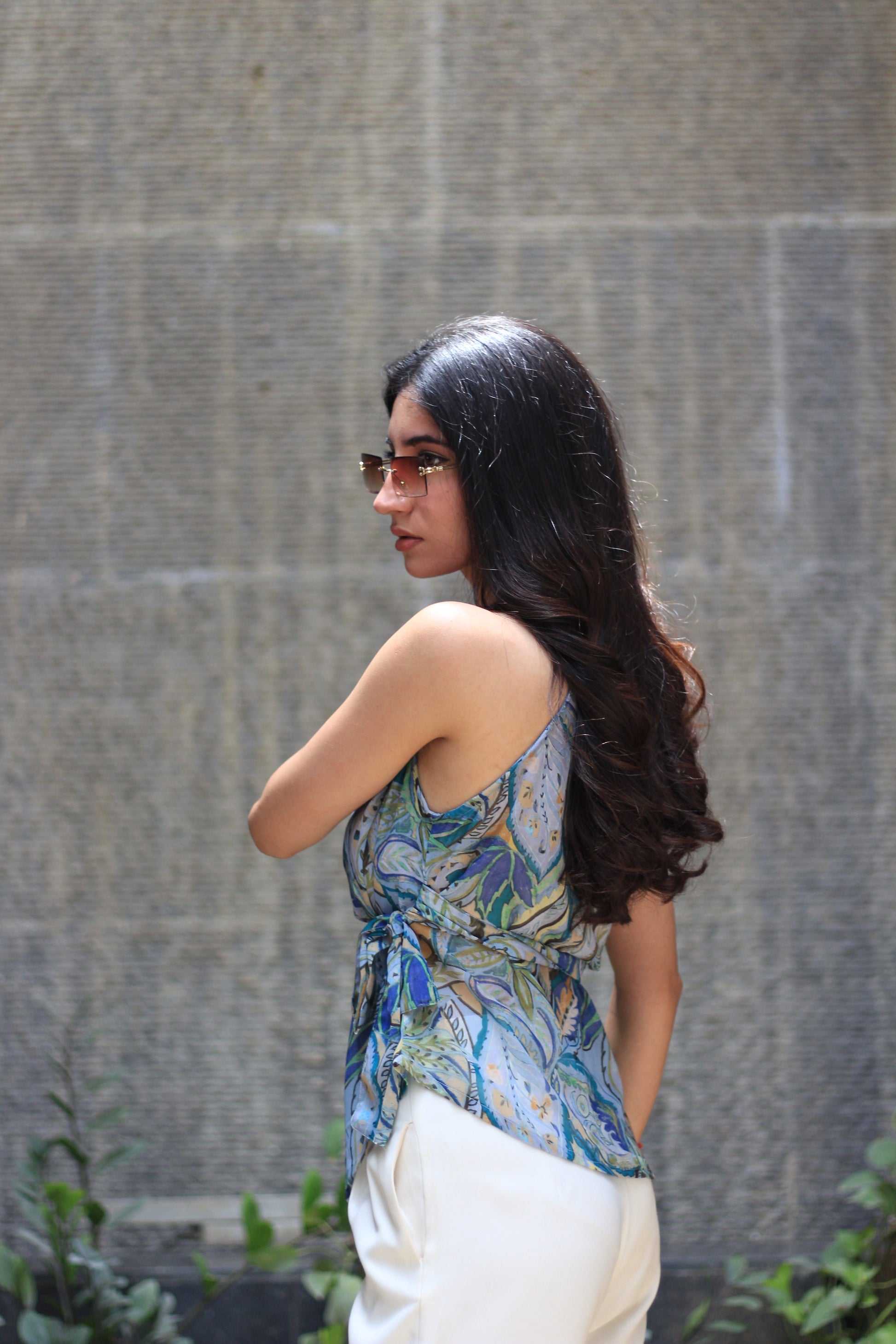 Cool, coastal, and a little bit flirty, The Ocean Martini Top is the definition of effortless glam. Crafted in a printed georgette, it features a breezy cowl neckline and an asymmetric hem that moves with you. The waist comes with a soft self-tie belt to cinch things in just the right way, giving you shape without sacrificing ease.