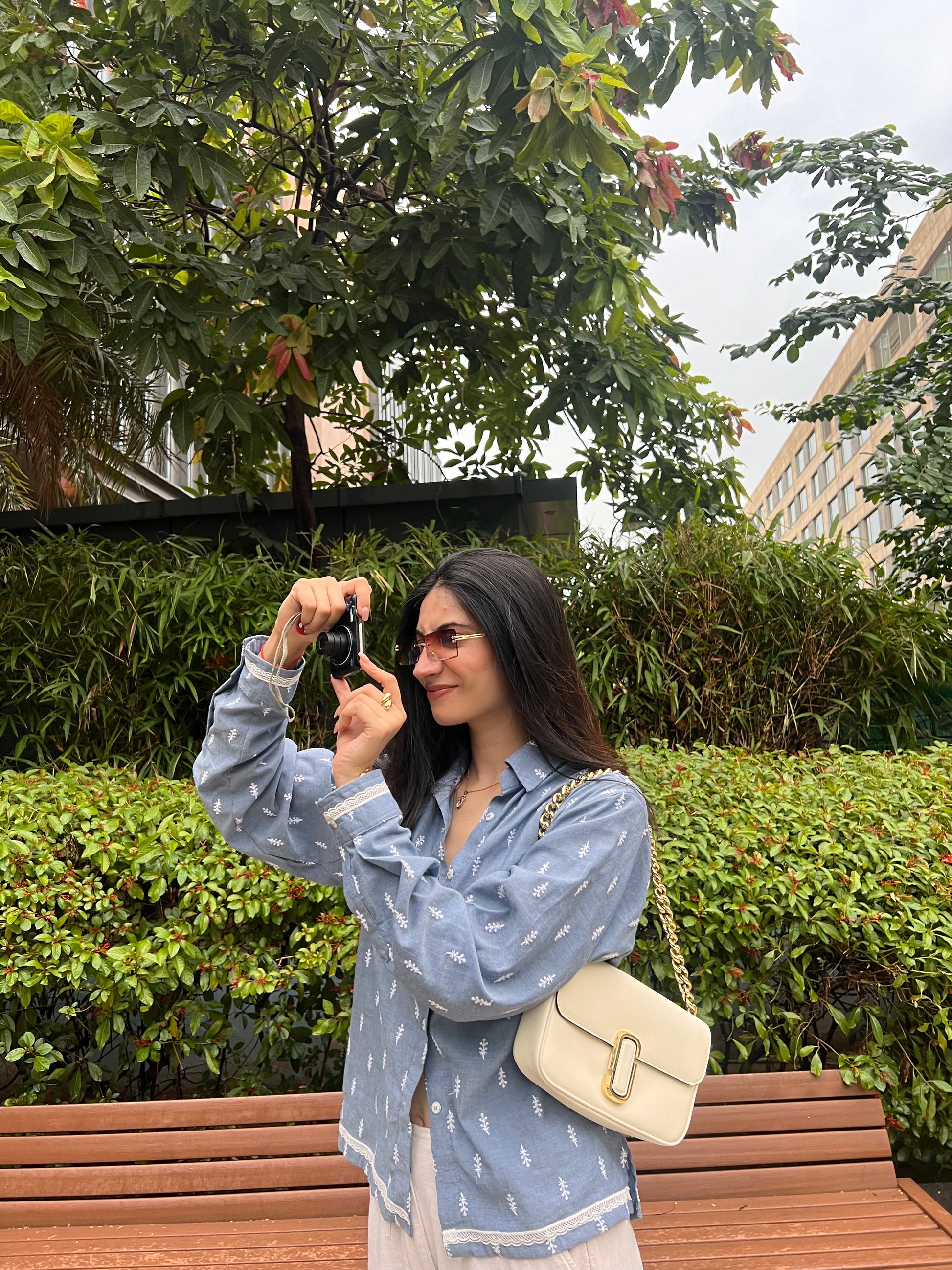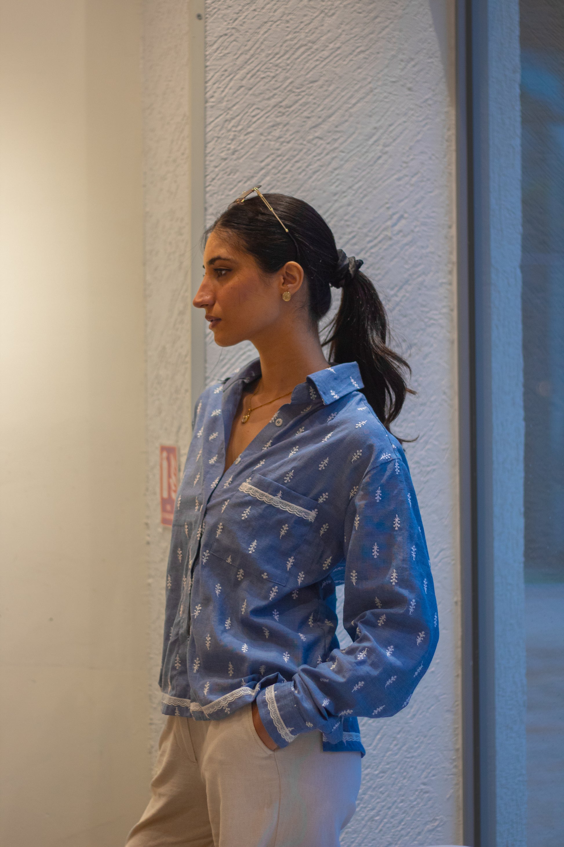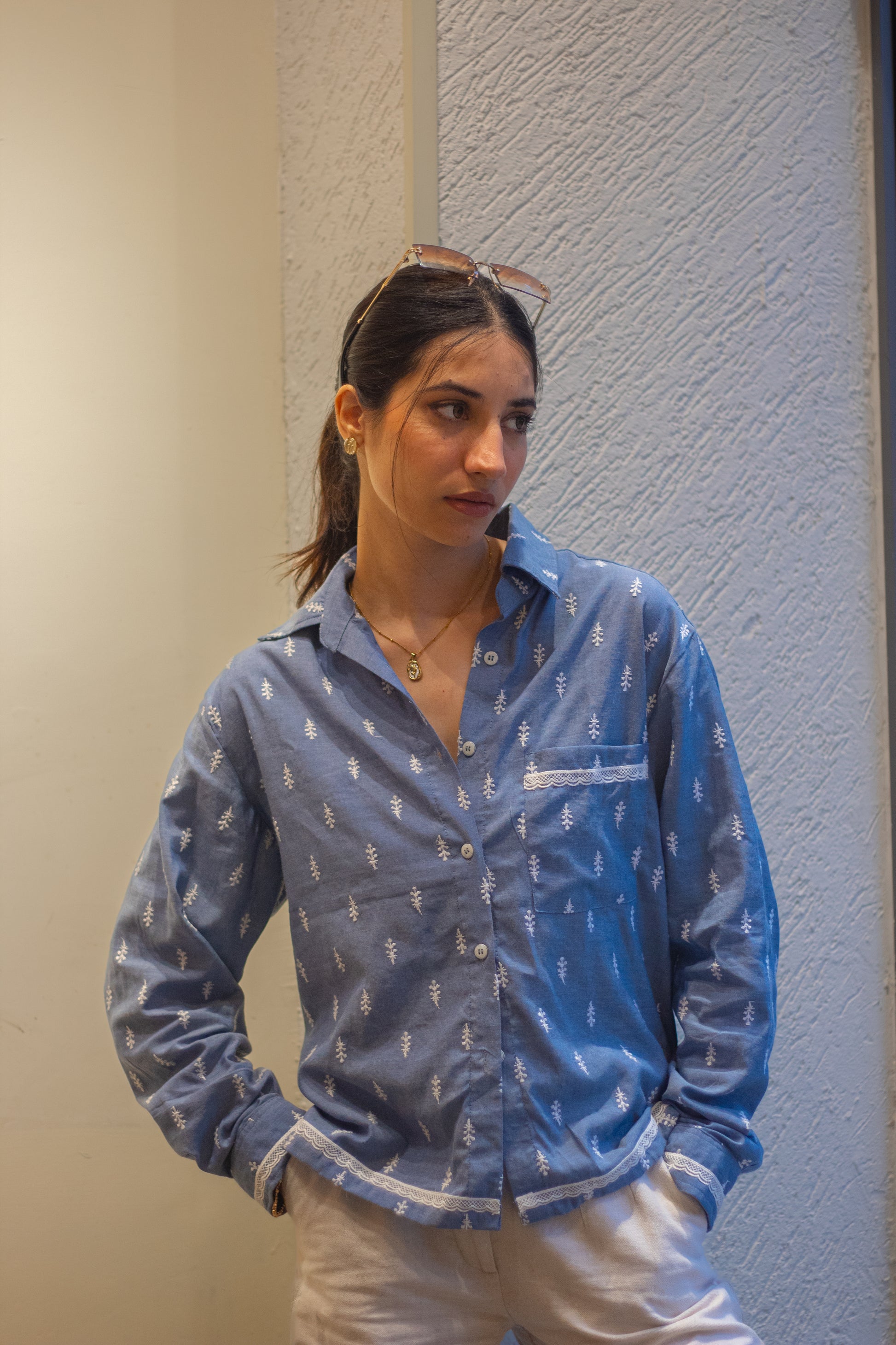 Clean, crisp, and charming, The Blue Lagoon Shirt is what dreamy summer mornings are made of. Tailored from 100% cotton, it features all-over delicate embroidery and lace insert detailing that whispers quiet luxury. The oversized silhouette makes it breathable and easygoing, without ever compromising on polish.