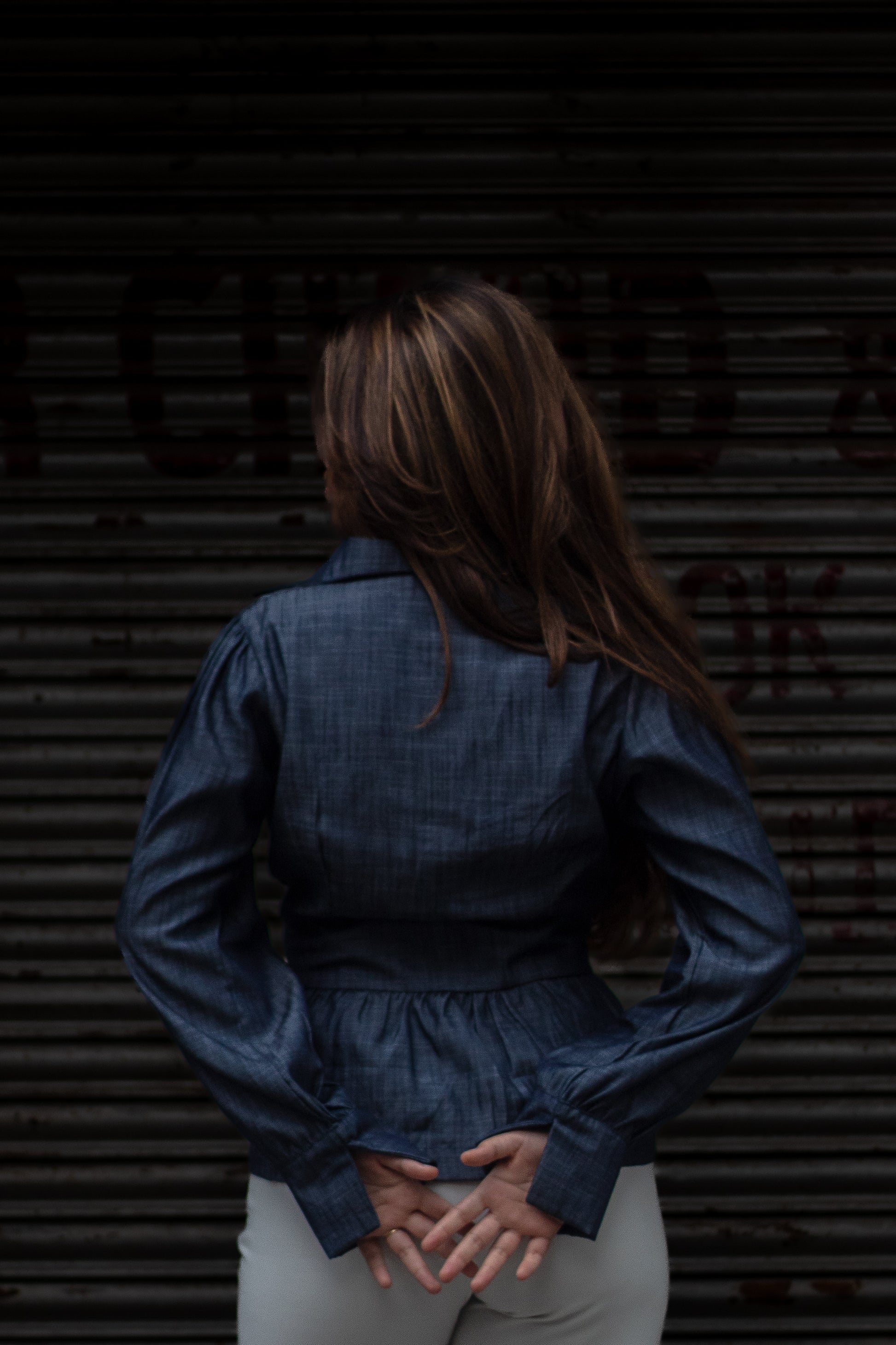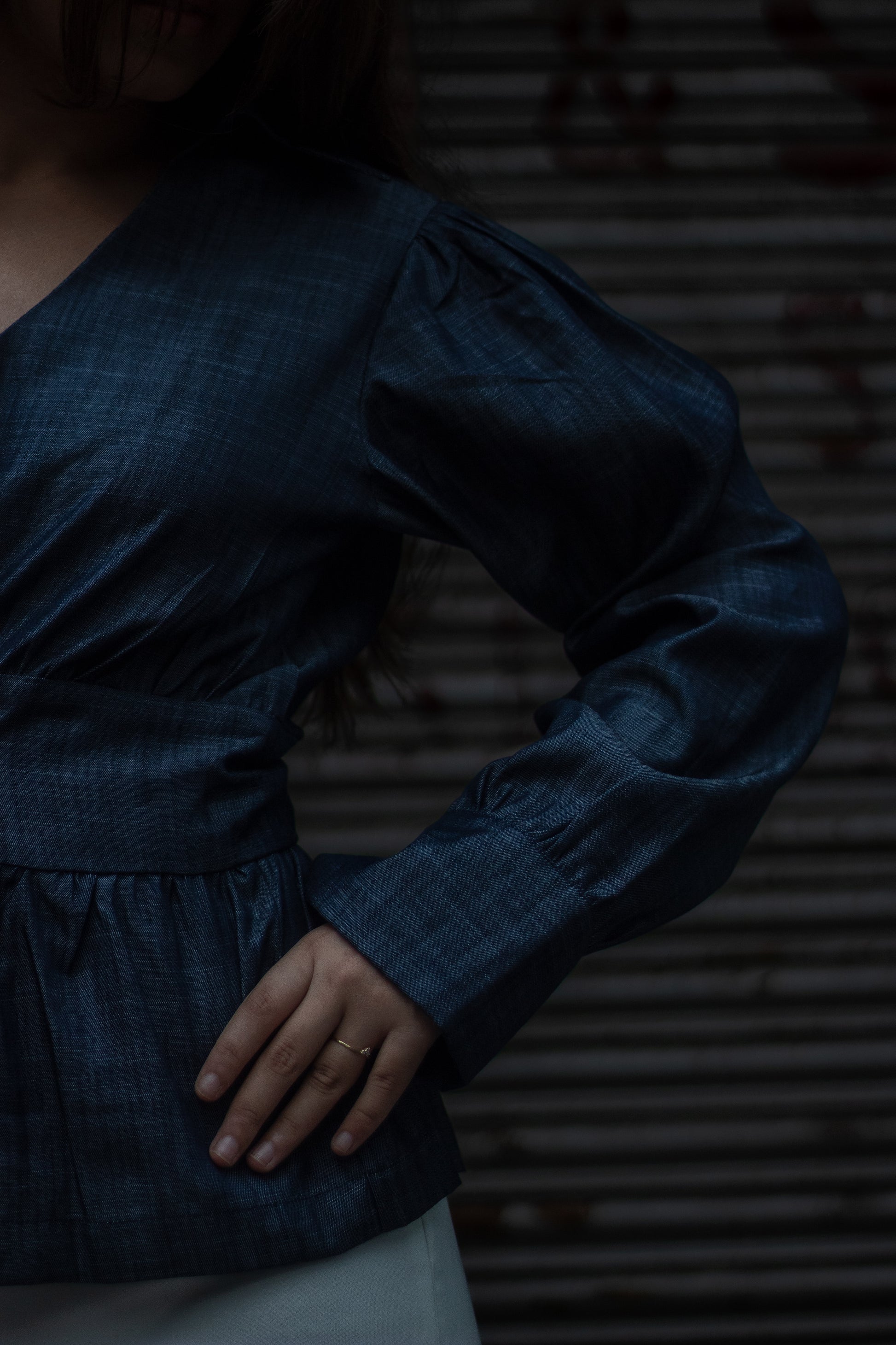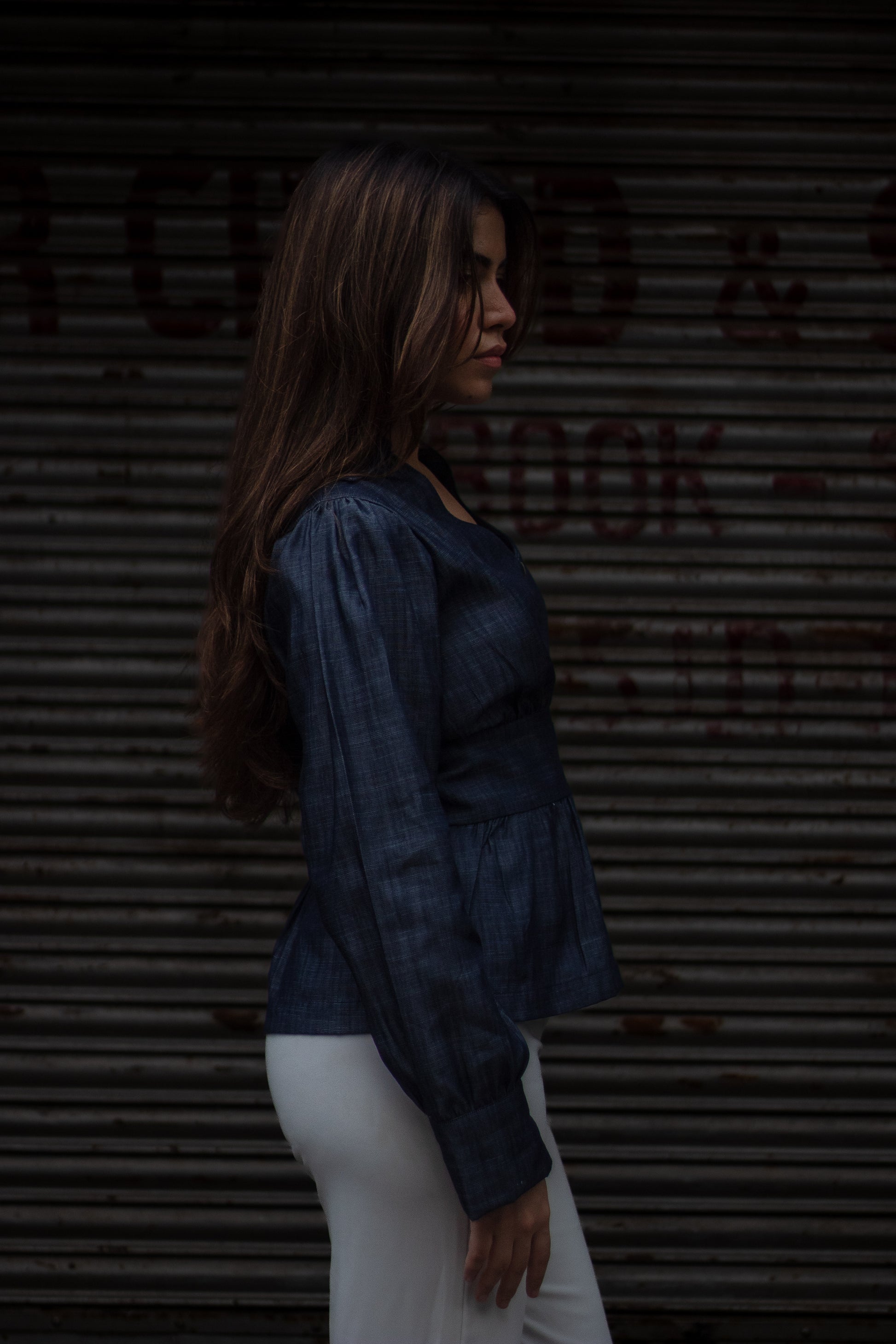 The Midnight Top is crafted in luxe denim fabric, designed with a sharp collar and flattering V-neckline. A sleek front zip detail adds modern edge, while the cinched waistband and tie-ups at the back sculpt your silhouette perfectly. With soft gathers at the sleeves and waist flowing into a peplum hem, this piece balances chic tailoring with feminine ease. Effortless by day, elevated by night- an instant classic in your wardrobe.